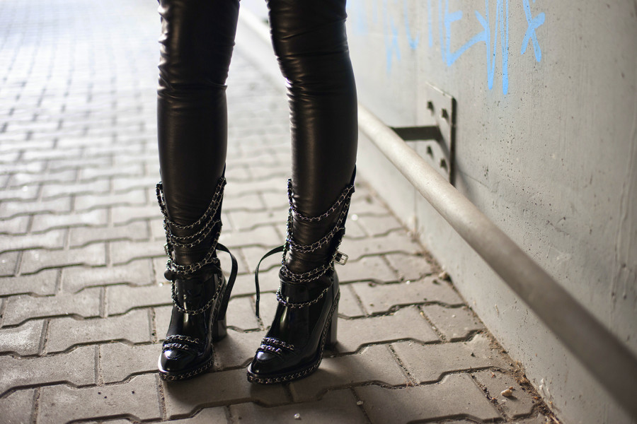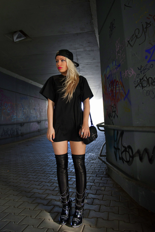CHANEL runway chain boots // GIVENCHY Obsedia bag // SOFIA RAFAELI dress & above knee leather socks // MICHAL HEJNY rings // VINTAGE faux-leather snapback