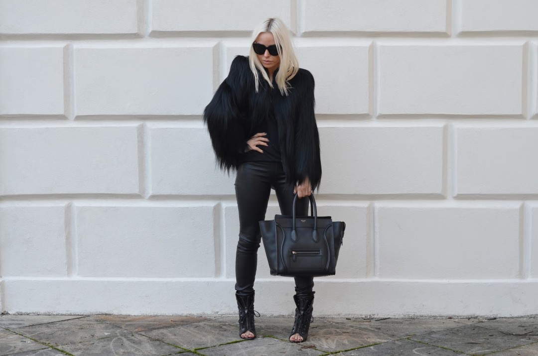VINTAGE gorilla real fur jacket // HELMUT LANG leather leggings // CÉLINE Luggage handbag // ALEXANDER WANG Freja boots // CÉLINE Audrey sunglasses