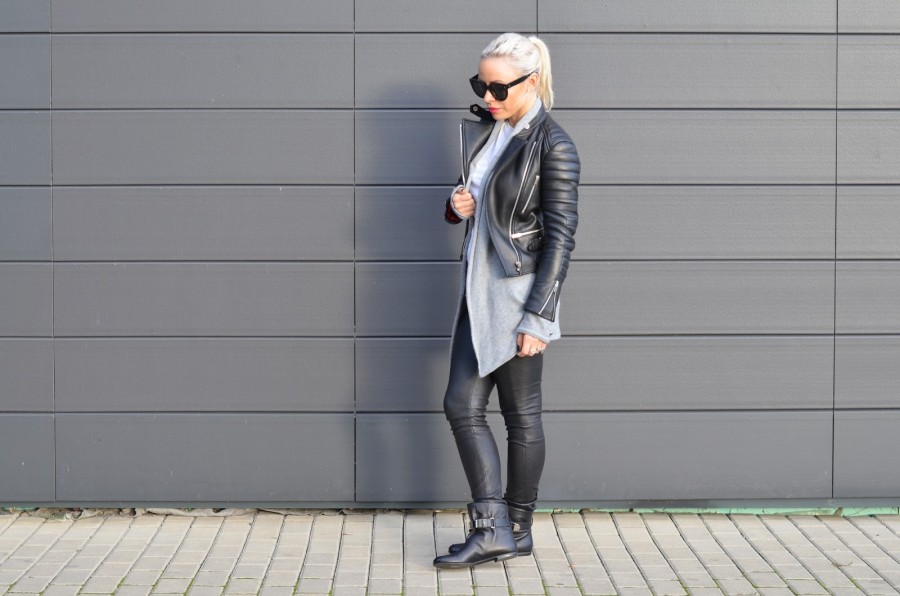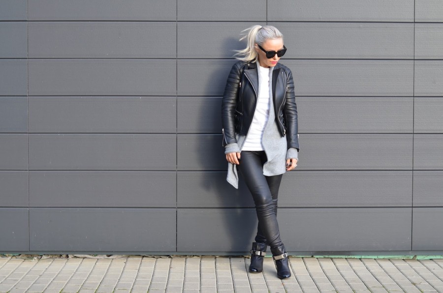 CÉLINE black biker jacket, sunglasses // H&M t-shirt, grey sweater // HELMUT LANG leather leggings // GIUSEPPE ZANOTTI low boots