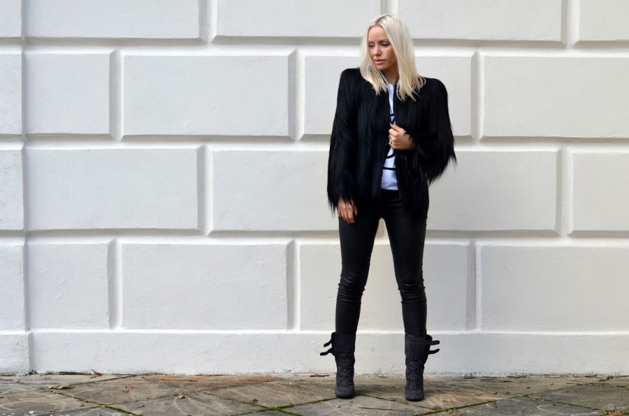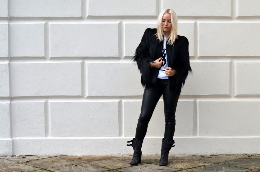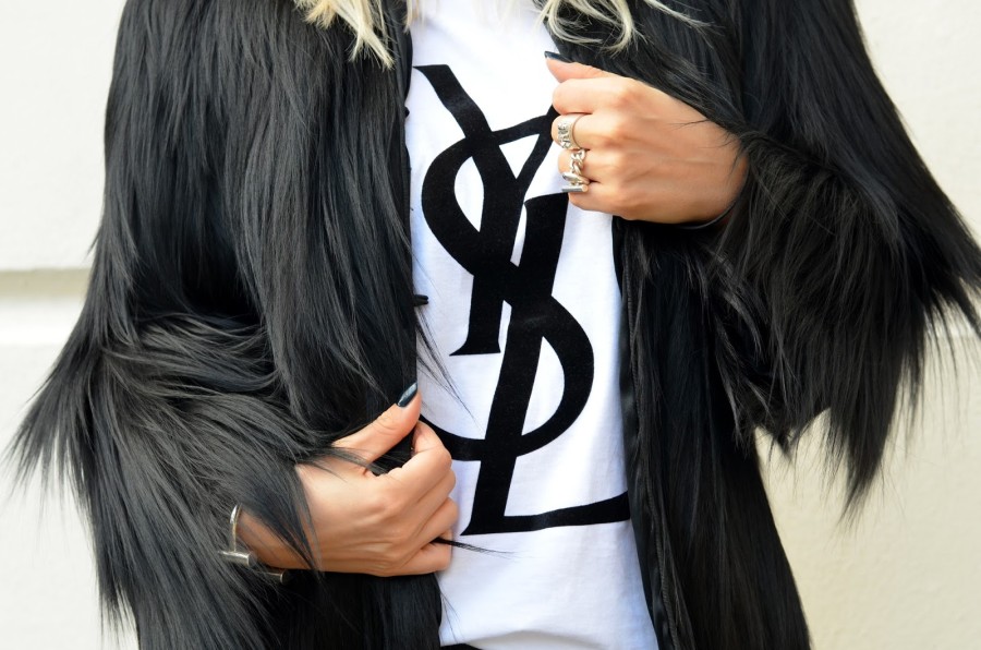 VINTAGE gorila fur jacket // YSL logo t-shirt // HELMUT LANG leather leggings // LAURENCE DACADE Merli boots // HERMÉS rings // CÉLINE bracelet