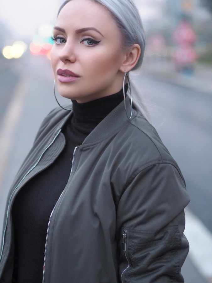 Shooting a few minutes before it was dark. Absolutely simple outfit and again my favorite baseball jacket in extended length. Also this time I tried a new hairstyle and lipstick - surprisely, Essence from Rossmann drugstore. Many of you have been asking how i´m doing my eyeliners, so I decided that i need to make a video 🙂 I hope you will like it..Thanks again to everyone who voted for me in the Blogger of the year contest and who had not yet, you can vote here. I hope to meet you there and will have the opportunity to get to know some of my fans.