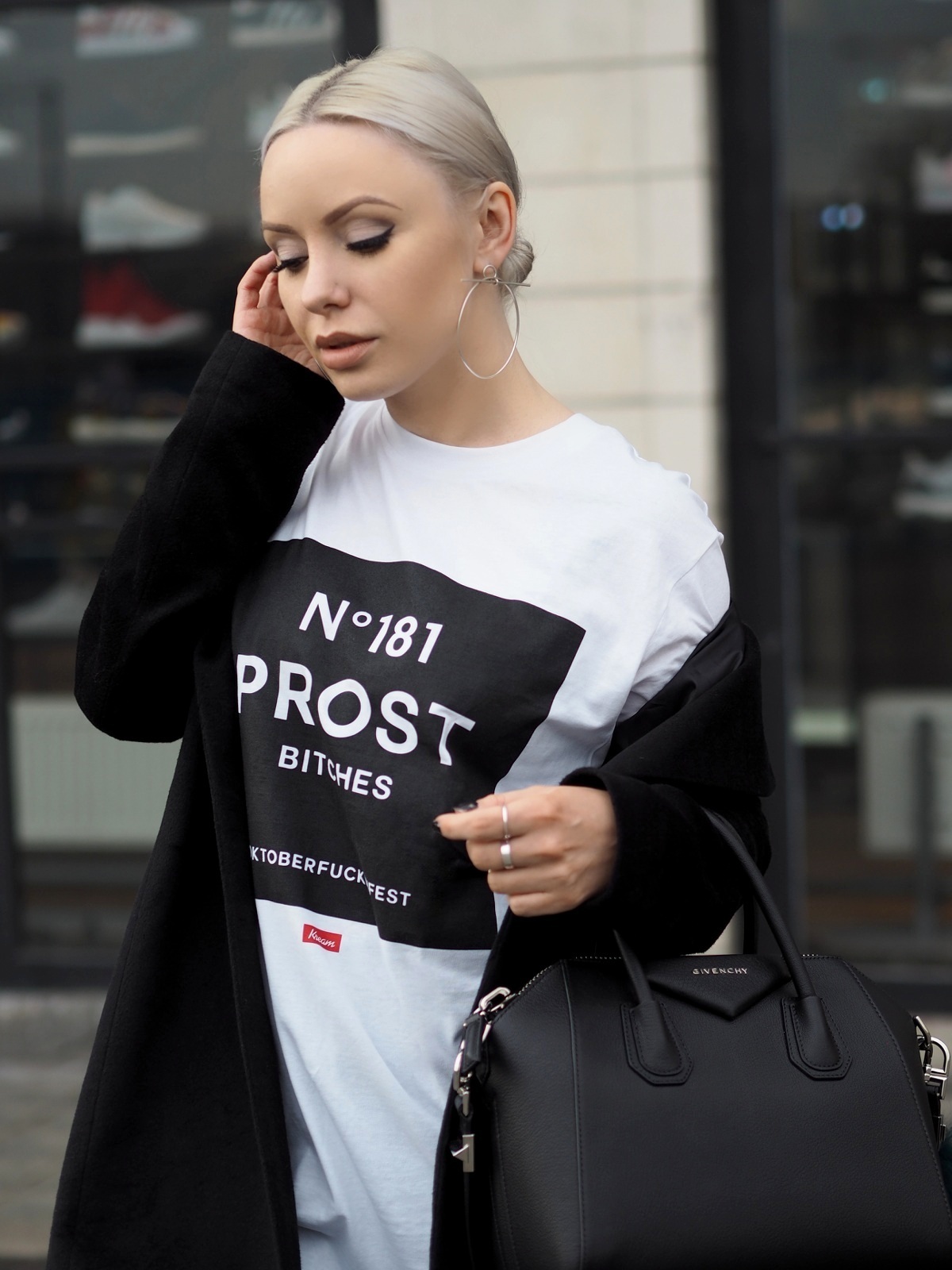 SAMMY DRESS wool coat here / KREAM t-shirt here / H&M jeans / GIVENCHY Antigona bag here / NIKE HUARACHE here