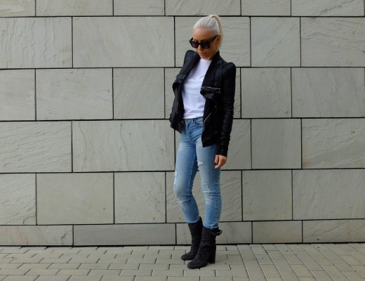 H&M destructed blue jeans // RICK OWENS peak shoulders leather jacket // H&M white tee // LAURENCE DACADE Merli boots // SAINT LAURENT bold sunglasses…