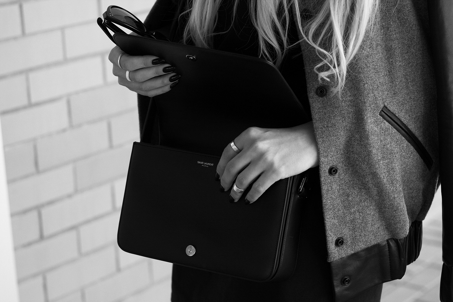 SAINT LAURENT PARIS Univesité bag // SOFIA RAFAELI custom made baseball jacket & t-shirt dress // MICHAL HEJNY rings // CÉLINE sunglasses // LAURENCE DACADE boots