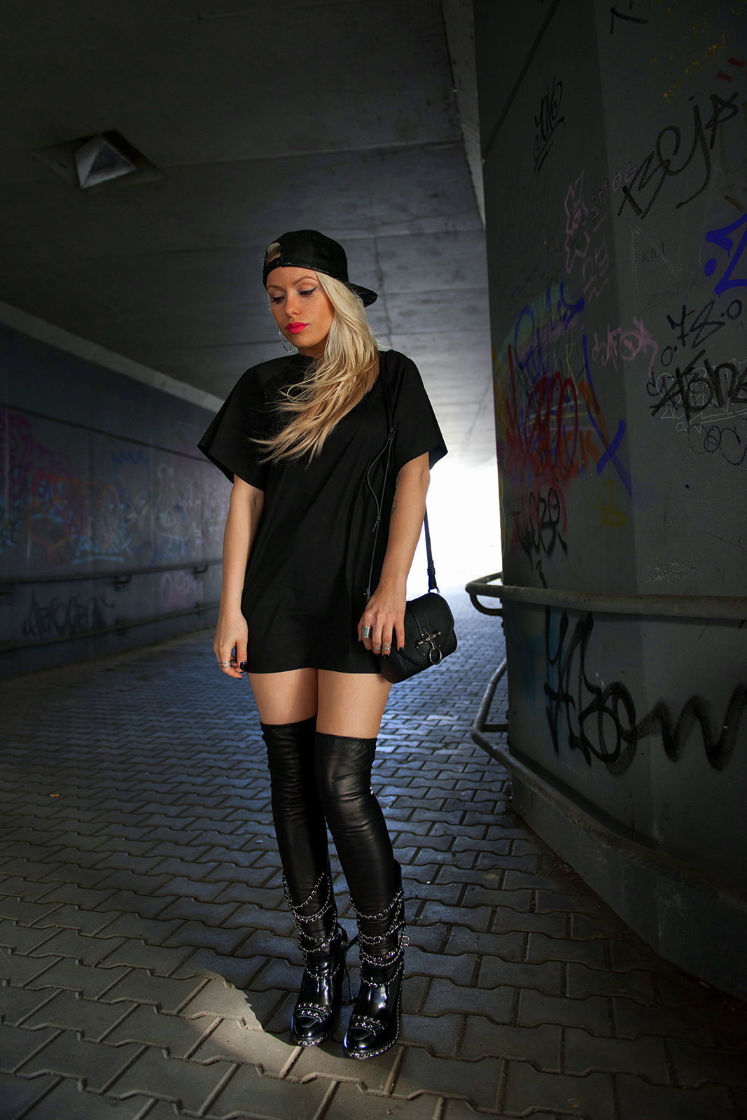 CHANEL runway chain boots // GIVENCHY Obsedia bag // SOFIA RAFAELI dress & above knee leather socks // MICHAL HEJNY rings // VINTAGE faux-leather snapback