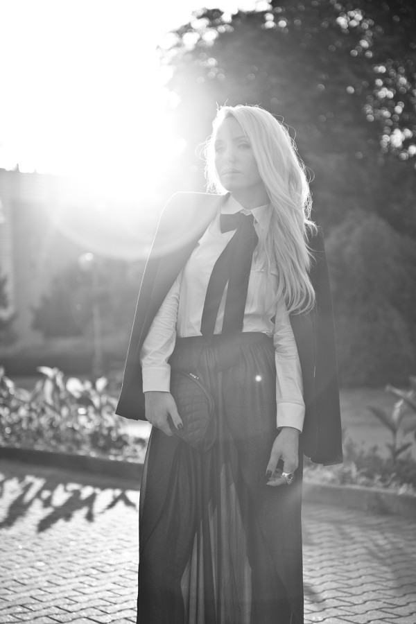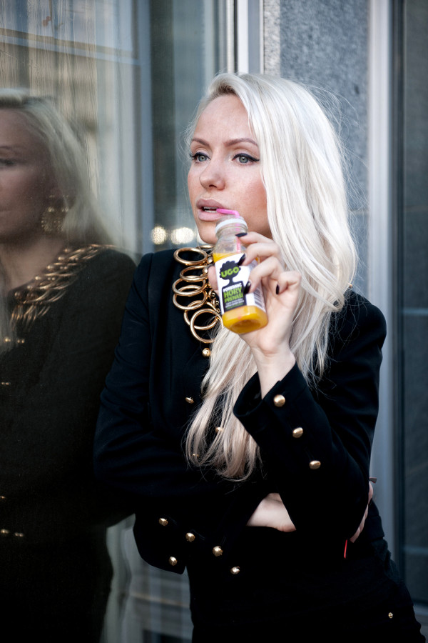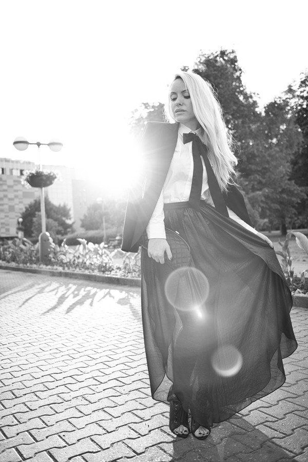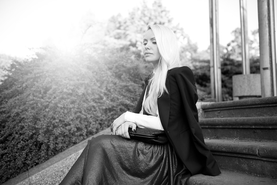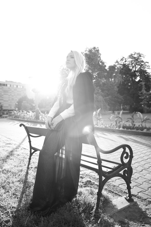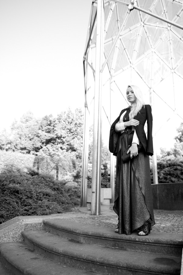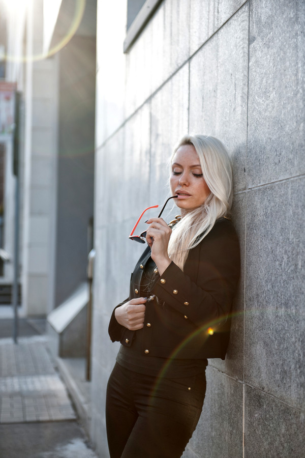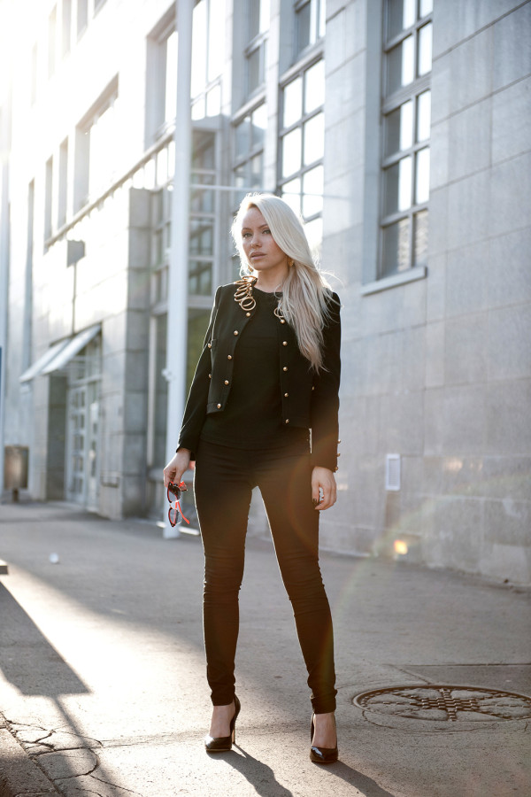 This jacket I recently showed few days ago on my Instagram. I bought it in Fashion Temporary Store, a pop up shop at the Galerie Harfa. I caught my eyes at first on the gold embellishments, which is typical for the brand Moschino. Since normally I do not wear gold accessories, it was hard to choose something quickly for this jacket. Finally, I choosed leggings from H&M, classic simple Shellys pumps and stylish sunglasses that the photos are unfortunately not much to see, and that I will soon perform in one of the other posts.